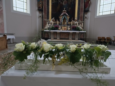 Seit vielen Jahren ist Isabell Bartenstein die Blumenschmückerin unserer Kirche. Sie richtet dabei ihr Augenmerk auf die Gegebenheiten der Kirche, des Kirchenjahres und auch darauf, dass die Pflanzen aus den heimischen Gärten geholt werden können.